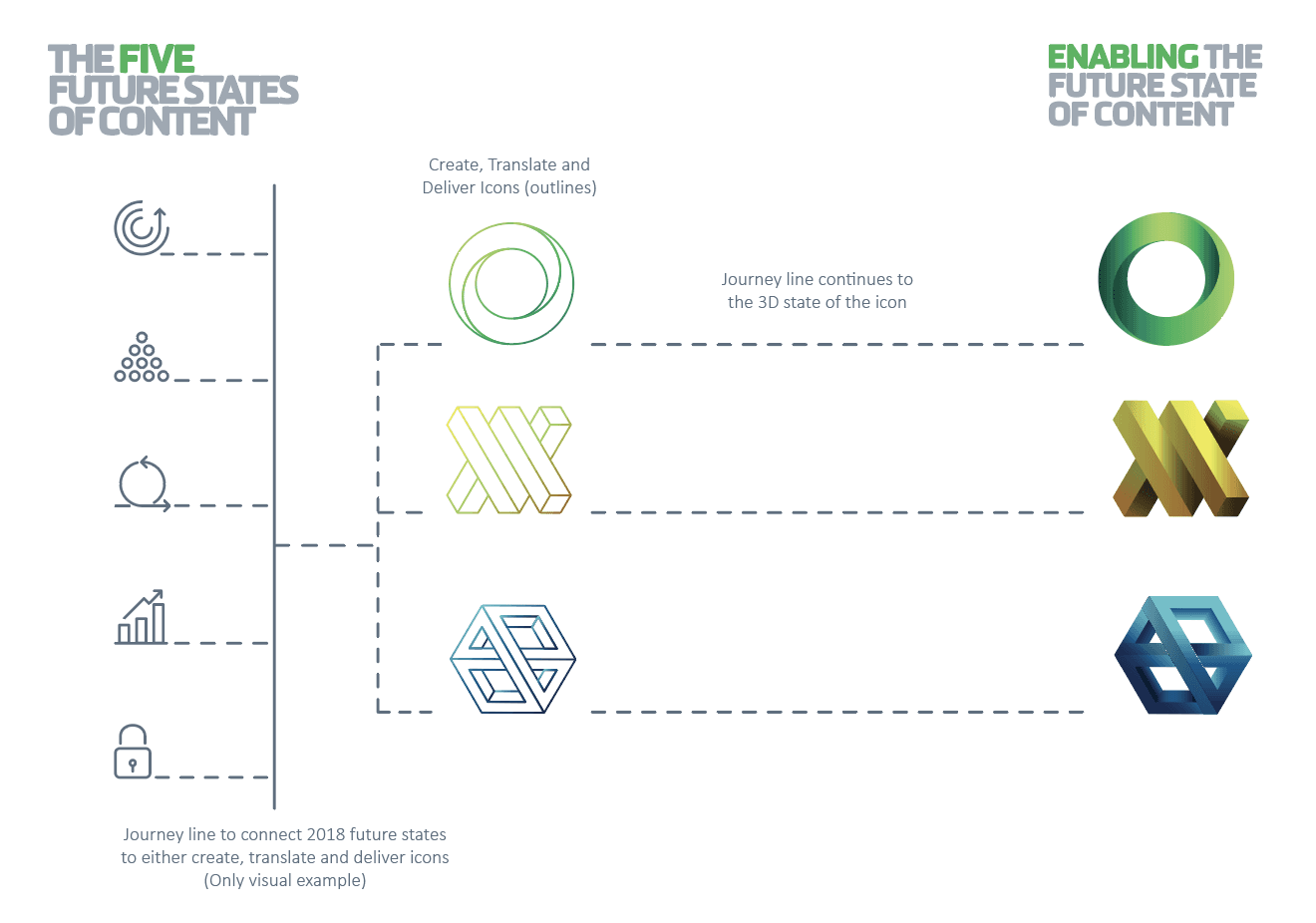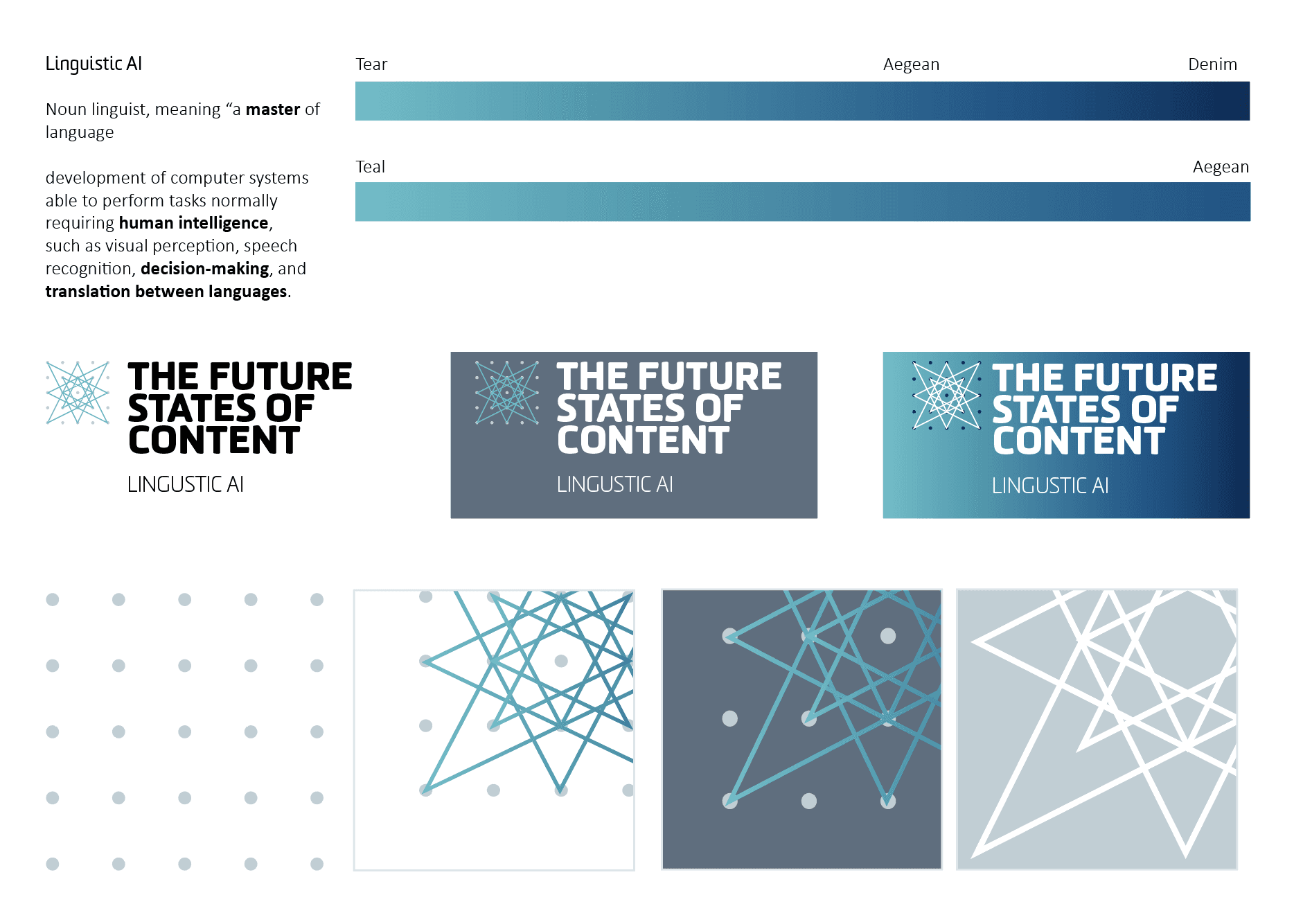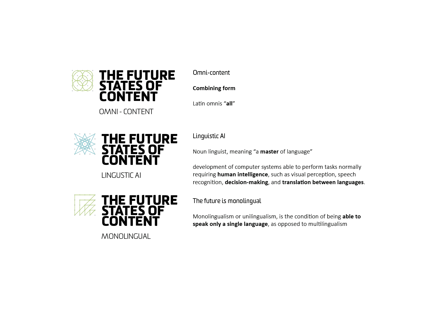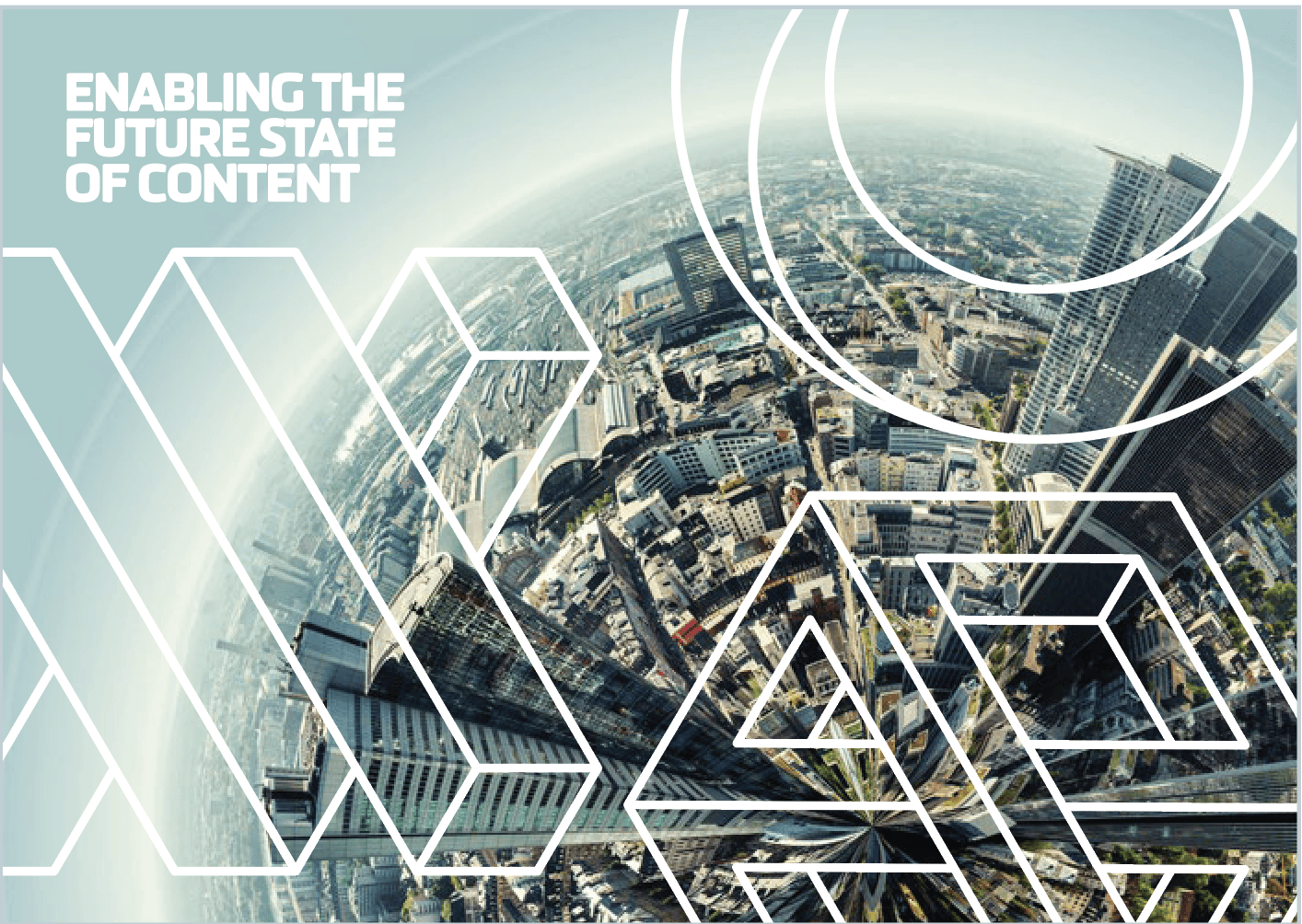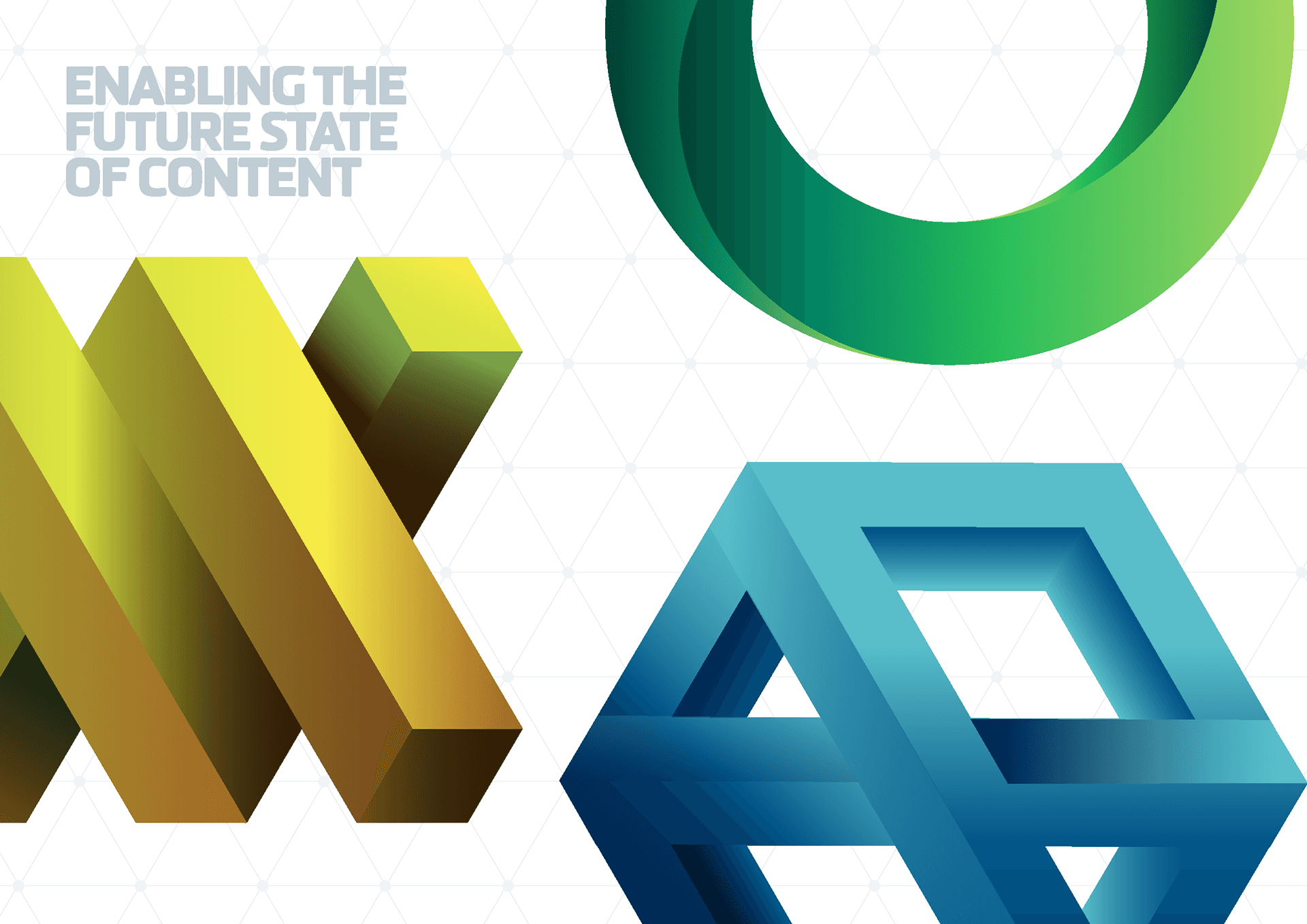 Create a visual identity that conveys the messaging 'the future of content' driven by a machine-first strategy, illustrating how technology and human expertise combine to create a seamless customer experience.